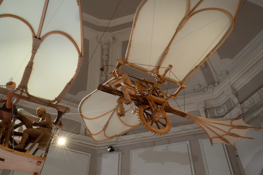 Beim Betreten der Ausstellung werden Sie von Informationstafeln begrüßt, die einen Überblick über den wissenschaftlichen und künstlerischen Werdegang Da Vincis geben. Sie können die Kurbeln berühren, die seine hydraulischen Mechanismen in Gang setzten, oder die Federbälle drehen, die seine Flugstudien illustrieren, während Sie den Erklärungen des Audioguides (optional) lauschen.
